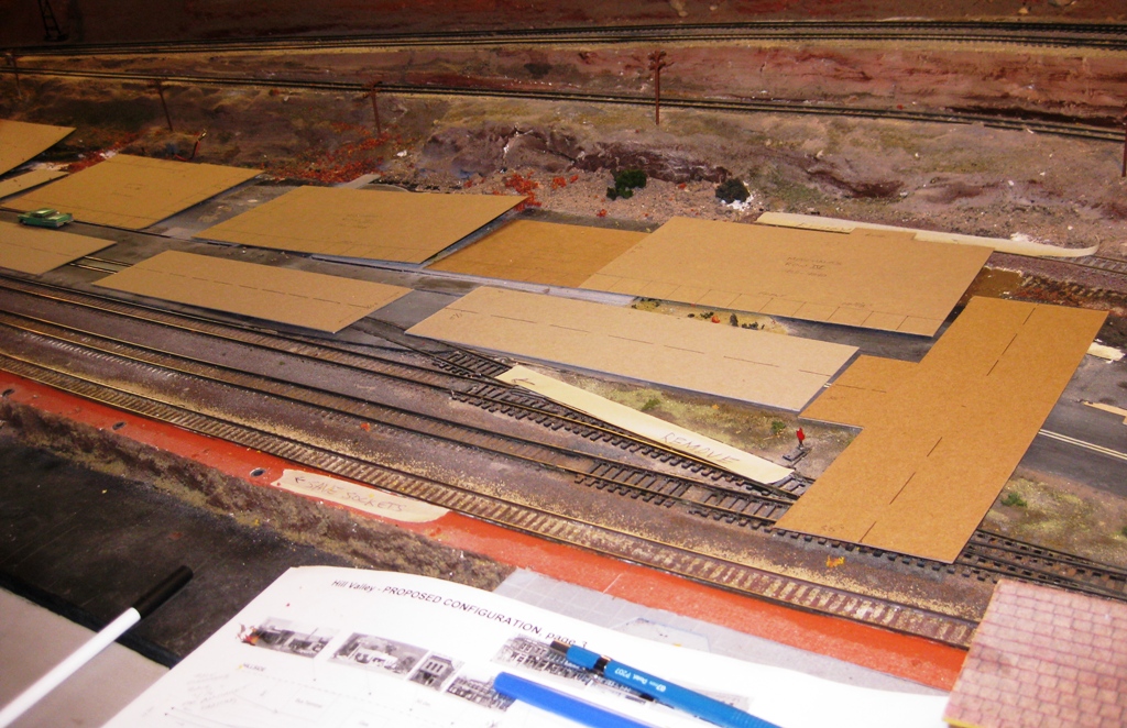 Many years ago I learned the best way to approach a project was to start with cardboard mockups. Whether they were 3-D or simple footprints didn’t really matter, so long as the mockup reflected the final desired measurements of the structure. Moving drawings around on a Visio plan is pretty simple, but moving cardboard mockups around on the actual layout tell the real story. It answers the key question, “Will it fit?” and when it doesn’t, “What do I need to remove?” So with this lesson in mind I used sheet cardboard (collected over the years) to create footprints for each of the buildings, as well as sections of roadway and intersections at the desired 3.5” width (or approximately 25’ in HO).