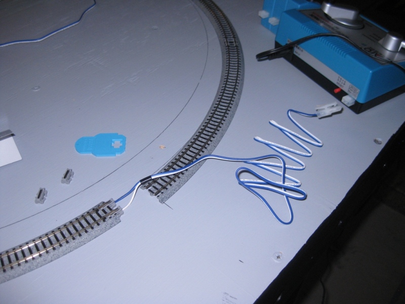 First off, color coding is important. Choose reasonable colors for your wiring (not all the same color!) and document your choices, both during the planning stage and installation. Kato happens to use Blue and White for track power. In forward running mode, White is positive (+) and Blue is negative (-). For our layout I wanted the normal direction of the train to be such that it would “back in” to the stub siding making it easy to drop cars. That required counter-clockwise running. A little trial-and-error with some track and the power pack determined that I needed Blue connected to the inside rail and White to the outside rail so that the direction of the train match the direction switch labeling on the power pack.