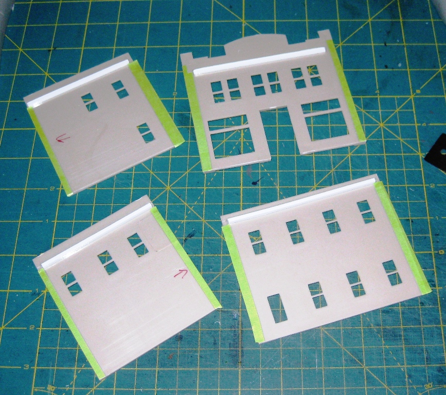The first step for DPM kits (now owned by Woodland Scenics) is prepping the walls. This includes squaring the edges to remove the mold marks, as described in the instructions. Next the roof supports are installed, using square styrene stock (available from Evergreen). I typically use 0.10” square stock, which is larger than what is supplied with the kit. Look closely in the photo and you’ll see the white strips near the top edge of each wall. Finally you’ll want to mask the edges where the walls will be glued together. This is necessary to prevent the paint from covering this area.