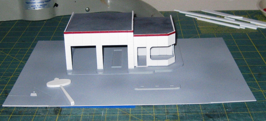 For the gas station, I needed to create an entire corner lot to provide building and pump island placement, a front sidewalk, and driveway entry. I used the same method as above with styrene sheets. Below you can see the “before” prior to painting, and the “after” showing a basic gray coat (to be further weathered), as well as the gas station itself with gloss white walls (simulating tile) and a red strip around the top to highlight the Standard Gas decals that will be applied later.